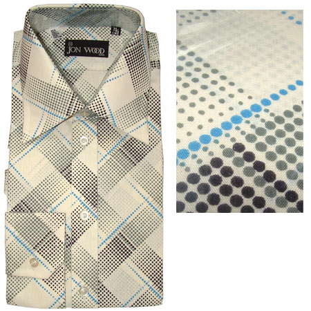 Amazing Op Art Dots + Lines pattern in grey, black and sky blue colours, on a cream colour shirt.